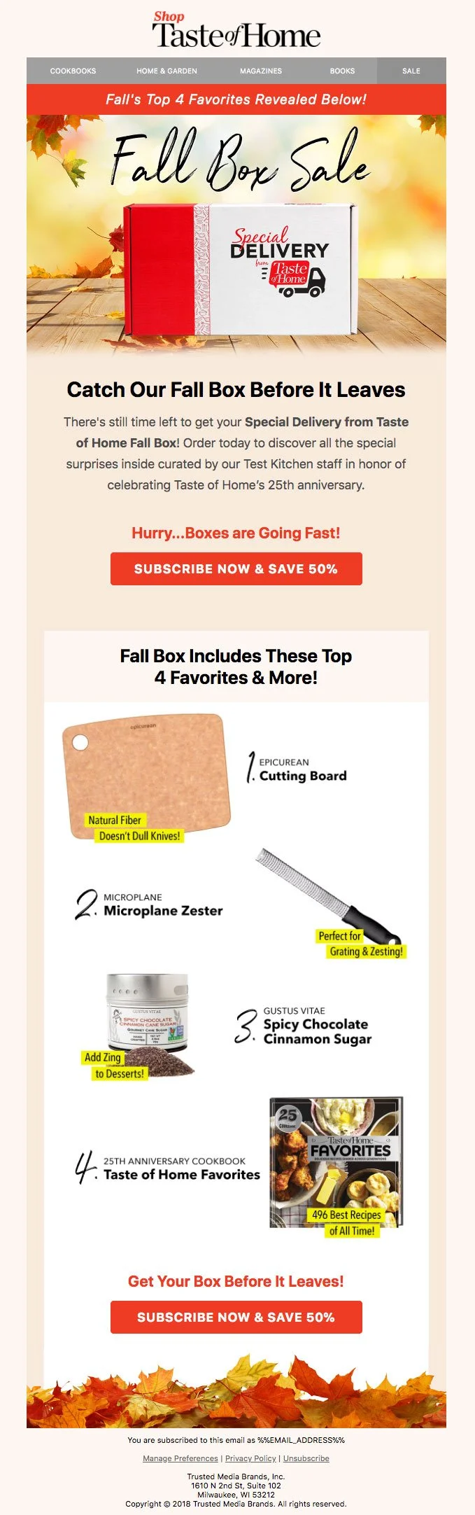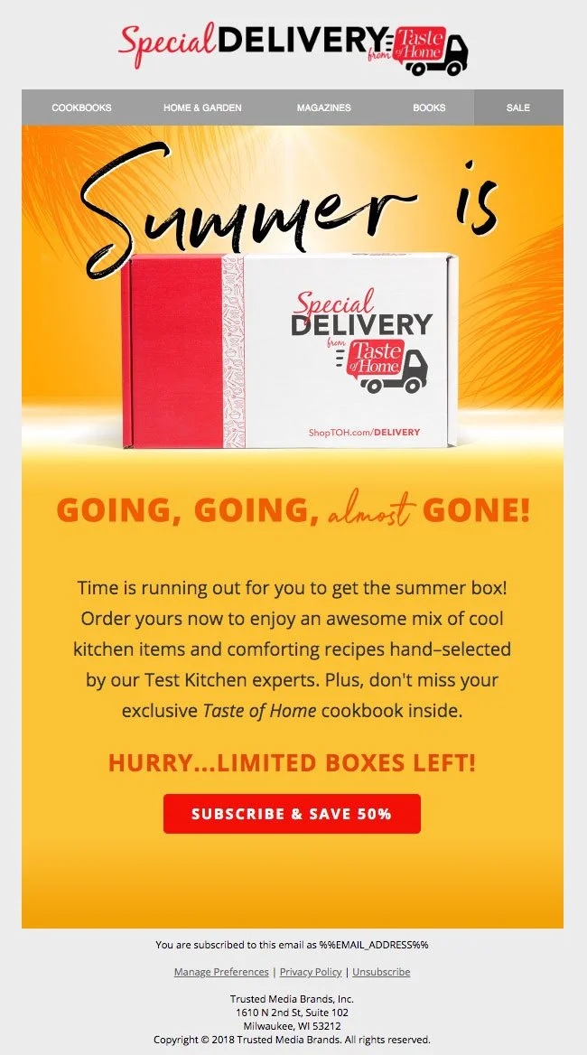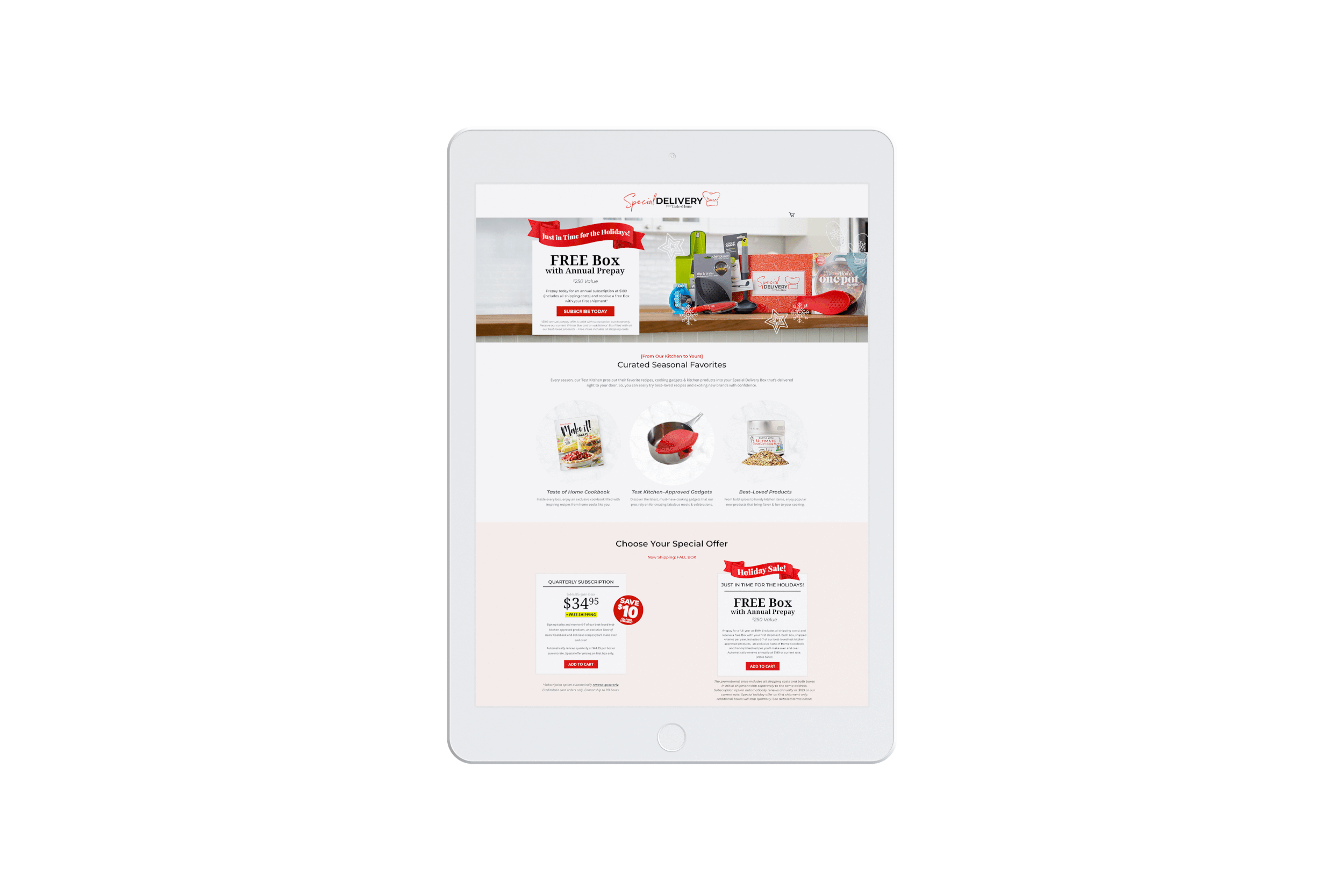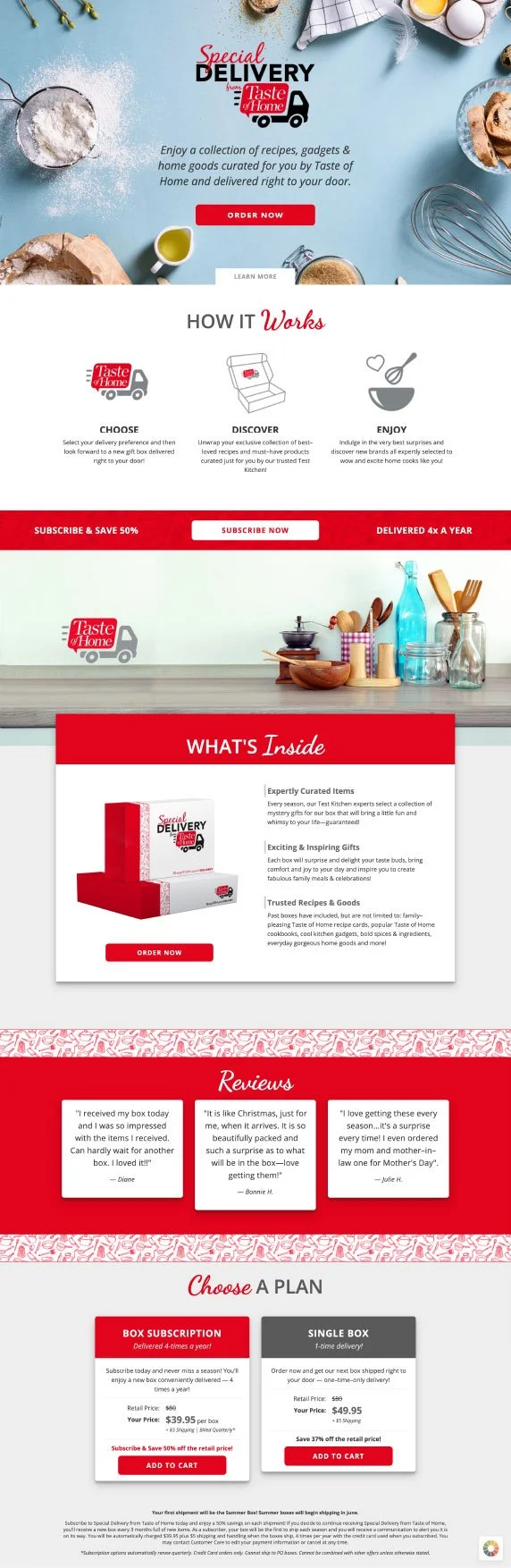 The Special Delivery Box from Taste of Home is an online subscription box marketed toward the Taste of Home audience. Each quarterly box contains a collection of cooking items curated by the TOH Test Kitchen. I worked on the launch of this program, including developing the brand voice, product packaging and email strategy. There are currently 15,000 active subscribers.
